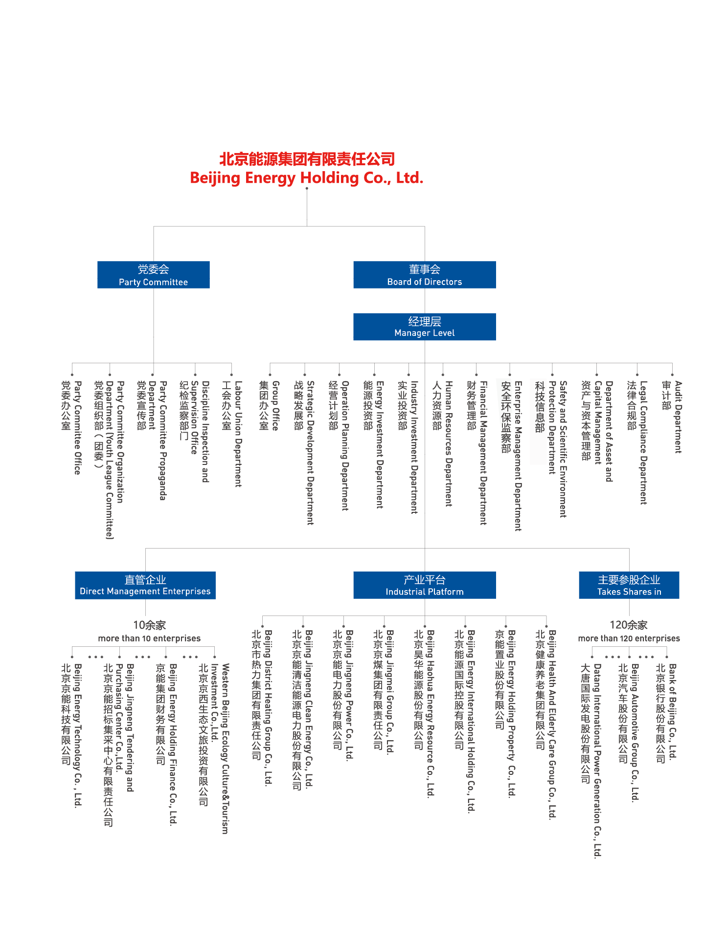 北京能源集團(tuán)有限責(zé)任公司(以下簡(jiǎn)稱“京能集團(tuán)”或“集團(tuán)”)是北京市人民政府出資設(shè)立的國有獨(dú)資公司,肩負(fù)著保障首都北京能源安全可靠供應(yīng)的重任。集團(tuán)成立于2004年,由原北京國際電力開發(fā)投資公司和原北京市綜合投資公司合并而成,2011年、2014年先后又與北京市熱力集團(tuán)有限責(zé)任公司、北京京煤集團(tuán)有限責(zé)任公司實(shí)施合并重組,實(shí)現(xiàn)了產(chǎn)業(yè)鏈條融合互補(bǔ)。經(jīng)過多年的資源整合,集團(tuán)由單一能源產(chǎn)業(yè)發(fā)展為熱力、電力、煤炭、健康文旅等多業(yè)態(tài)產(chǎn)業(yè)格局。2024年底,集團(tuán)資產(chǎn)規(guī)模達(dá)4934億元,年?duì)I業(yè)收入975億元,全資及控股企業(yè)860余家,參股企業(yè)120余家,擁有員工3.4萬余人,投資區(qū)域遍布全國33個(gè)省市區(qū)以及海外,控股京能清潔能源、京能電力、昊華能源、京能置業(yè)、北京能源國際、京能熱力六家上市公司,盈利水平長(zhǎng)期穩(wěn)居北京市屬企業(yè)前列。2024年在中國企業(yè)500強(qiáng)排名第247位,中國服務(wù)企業(yè)500強(qiáng)排名第87位。